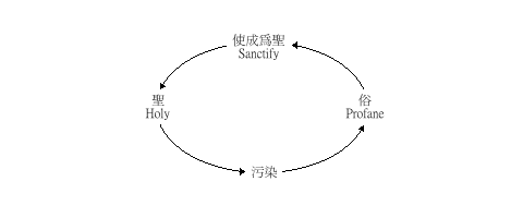 圣洁在希伯来文只是一个“圣”的观念。中文却已经把“洁”的观念也包括在内了。“圣”( q-d-sh 的原意是分别出来归给神。62在亚甲文的意思是使洁净、纯净、和奉献出来的,而乌加列文的基本意思是“圣”,含有宗教的色彩。63“圣”和“洁”其实有密切的关系,“洁”的原文是 t-h-r,它的意思是由不洁( t-m-')当中出来,就是洁净的。“圣”的意思是由俗的当中分别出来归给神,所以说,圣洁有不可分割的关系。凡是归给神的,都应该是“洁”的,但“洁”的若不归给神它是俗的,不是圣的。温恒用了这样的图表去表达它们之间的关系:64