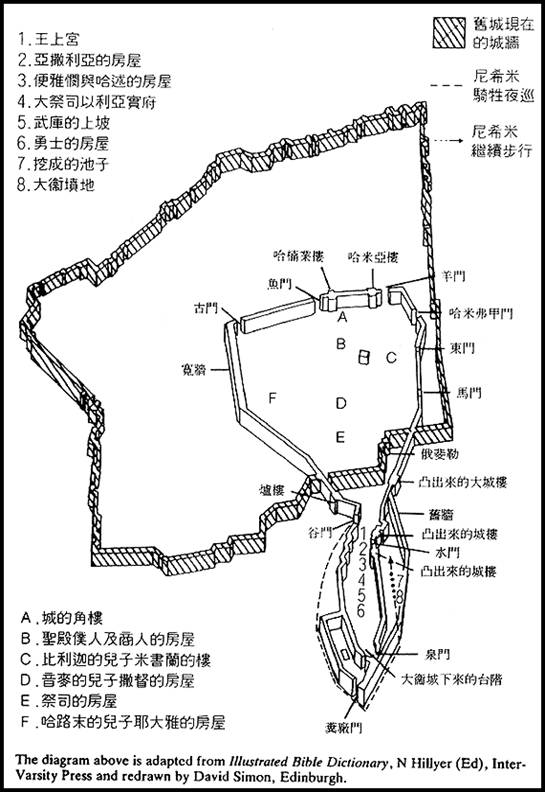 尼希米的夜行,附带给我们知道古代耶路撒冷的规画,为旧约里不多见的。这城受到在上建造的两座山的地形所限。这两座山自北至南,互相平行,中间有一个山谷,向东、西及南的山坡最险峻。东边的山是大卫王首先征服的地方;这城在君王时期逐渐开展至西边的山。尼希米的问题,或许不单是重建这城,还要决定他们是否将大卫王原来所建的,和以后扩建的,一并重建。